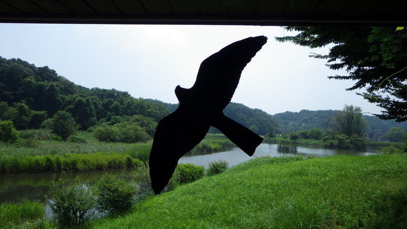 ガラス窓には紙を切り抜いたタカが貼ってありますが、これって飾りじゃなかったのですね。これを貼り付けることで、タカを恐れる野鳥がガラスに衝突しなくなるそうです。へぇー、今まで知らなかった(苦笑)。実は、この日は本物のオオタカの幼鳥も姿を現しました。