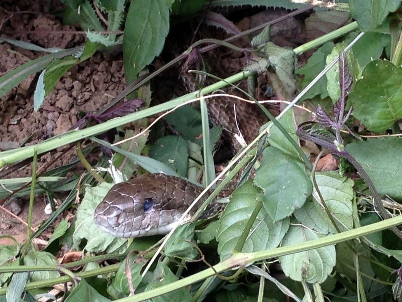 そんなわけで、最後は大蛇(?)の写真(笑)。この蛇には、この日に出会ったわけではありません。実は、私の住処の近くを歩いていた時、あまりの暑さにボーとしていて、この蛇を蹴飛ばしてしまったのです(苦笑)。アオダイショウでしょうか。いやぁ、マムシでなくてよかったです。それに踏まなくて本当によかった。