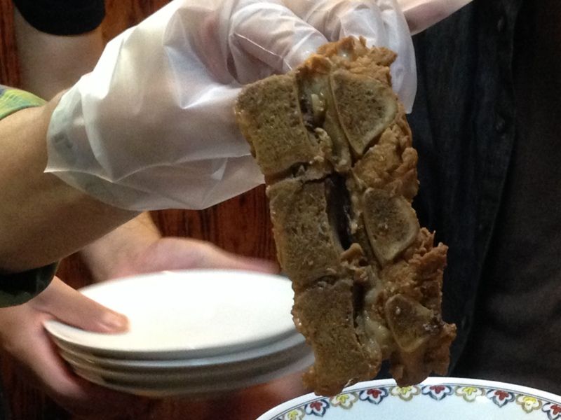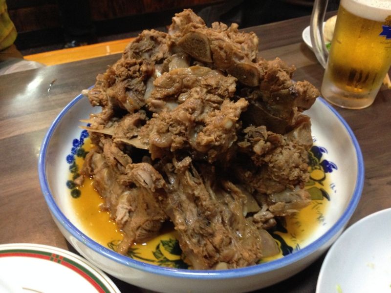 その料理の中でも最高にイケてたのが、この「醤大骨」。ブタの背骨に付いた肉を骨ごと醤油で煮込んで食べる中国の東北地方の料理だそうで、会話が無くなるほど美味。いやぁ、やはりブタ肉の食べ方は中国の人々にかなわないですね。