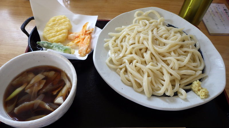 私が注文したのは「豚バラつけうどん」。この店では、うどんを大盛(500g)にしても値段は同じです。当然、私は大盛。野菜の天ぷらも付けて800円は安いですね。うどんも腰があって、なかなかの美味。是非また来たいお店です。