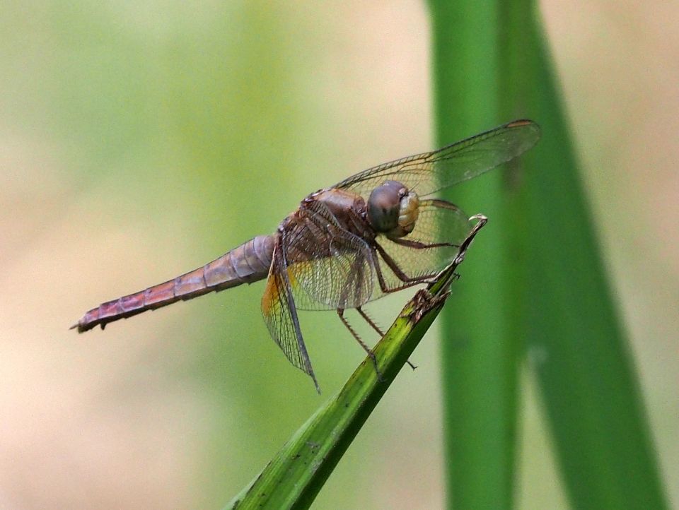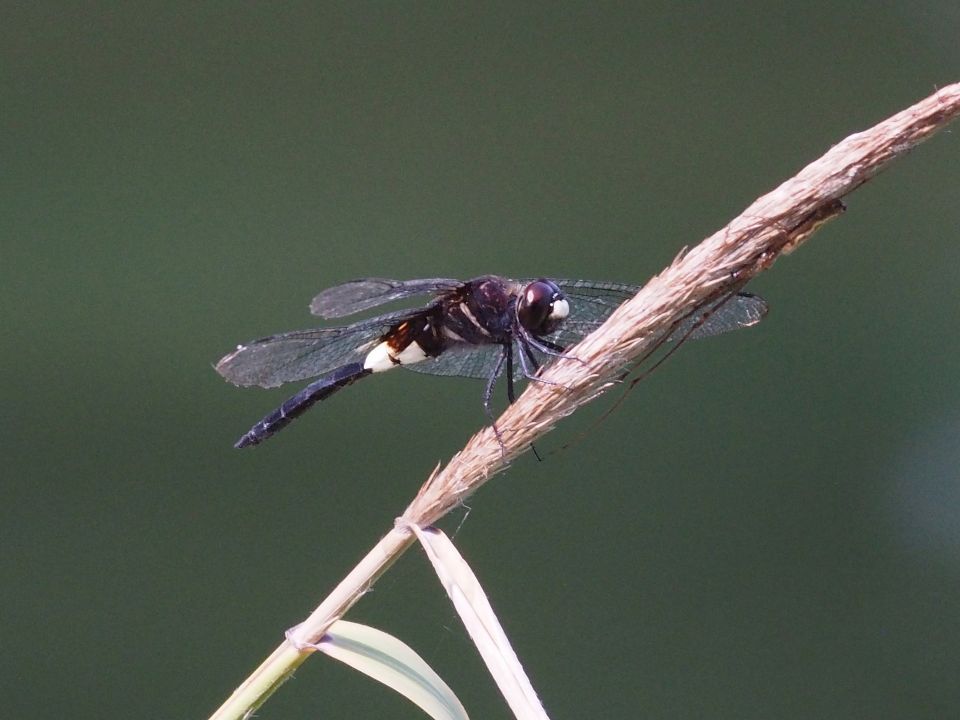 このトンボはナツアカネという種で、秋になると色が赤くなります。いわゆる「赤とんぼ」ですが、秋に山から里に下りてくる別の「赤とんぼ」のアキアカネと区別するのが難しい(というか、私は色んな赤とんぼがいることを知りませんでした、苦笑)。今回、胸部の模様で区別する方法を教えてもらったので、秋にはうんちくを語れます(笑)