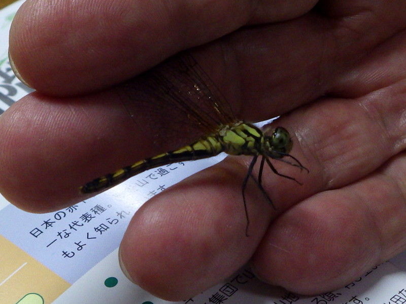 さて、湿地の観察会。その前にトンボの観察(笑)。今回、湿地を案内していただいた自然解説員の方が事前にトンボを捕らえ、色々とご解説いただきました。