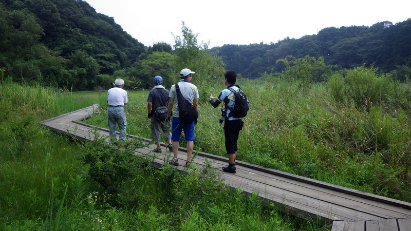この自然観察員の方は本来、野鳥の解説が専門だそうです。野鳥好きオジサンとしては期待値が高まったのですが、酷暑の中ですから、野鳥はほとんど見られないとのこと。残念。というわけで、今回は主に湿地に生息するトンボの観察になりました。