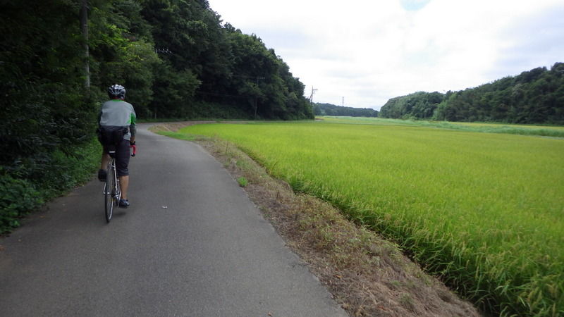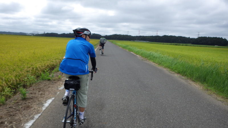 ひとしきり雑談して、さあ出発という時に、ワンチャンがお見送りに来てくれました。で、またしばし自転車談義です(笑)。そして出発。愚兵衛さんのご案内で、手賀沼から印旛地域の谷津などを走り、四街道のうどんを目指します(笑)。既に田んぼの稲は黄金色でした。
