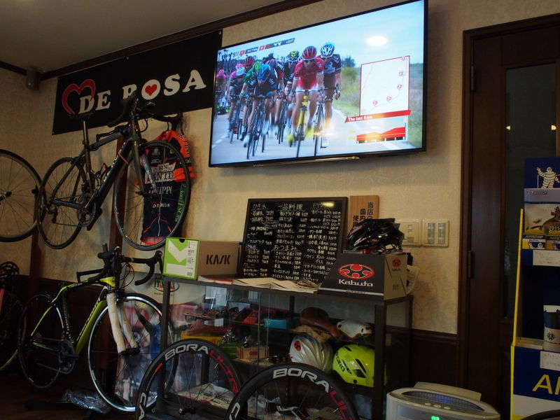 店内ではロードレースの録画が放映されていますので、スポーツバーの雰囲気もあります。でも、いかにも凄そうな「DE ROSA」のバイクが掛けてあり、「BORA」のホイールが無造作に置かれてあります。
