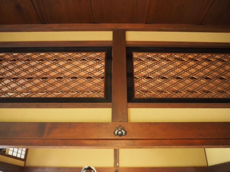 そんな私の記憶に残った数少ない話の一つがこれ。この欄間、何気に凄いそうです。斜めの格子が寸分狂わず組み合わされており、見学に来た大工さんが「これは凄い」と驚いたそうです。