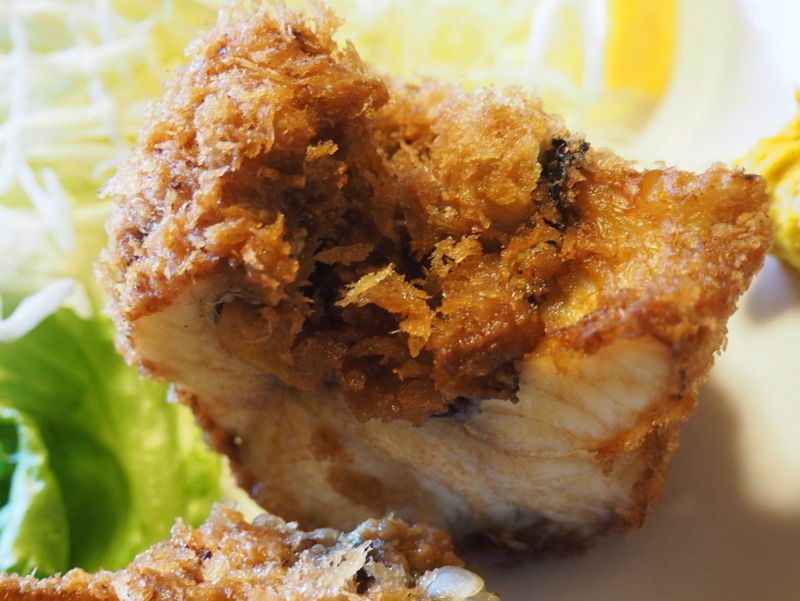 で、アジフライか白身魚フライかで迷ったのですが、アジフライは量がヤバそうだったので(実際、はんぞうさんが注文したアジフライ定食には3枚のフライが乗っていました)、白身魚フライ定食を注文。最初「おっ、ちょうどいい量」と思ったのですが、魚の厚みが凄い。