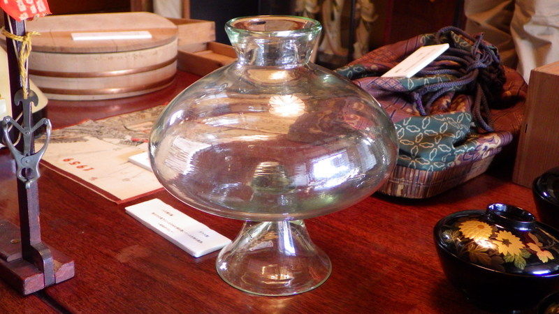 水木さんは、なかなか"ハイカラ"な人だったみたいですね。上の写真で女性の方が触れているのが、ハンドル式(?)のカツオ節削り器、そして下の写真がハエ取り瓶だそうです。こんなものが以前にはあったのですね。初めてみました。