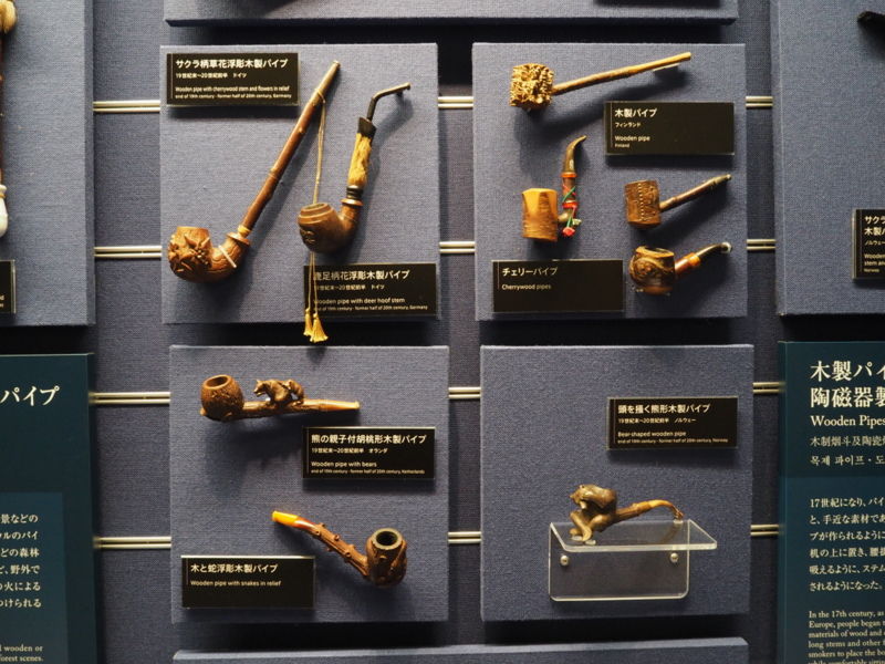 最後は「タバコ」のエリア。ここでも、南米アンデスが原産の植物タバコが、世界中に喫煙の習慣と共に広まった歴史を詳しく学べて、面白かったです。ただ、ここのメインは何を言っても、大量に収集された変態的なパイプのコレクションでしょう(笑)