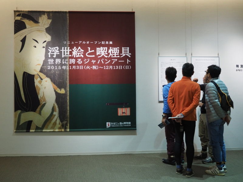 ちょうど今は、リニューアルオープン記念展「浮世絵と喫煙具〜世界に誇るジャパンアート〜」を開催しており、これを観に来たわけです。最初は「物足りないかも」という予想でしたが、博物館も記念展も想像をはるかに超えていました。入場料100円で素晴らしい展示を堪能できました。