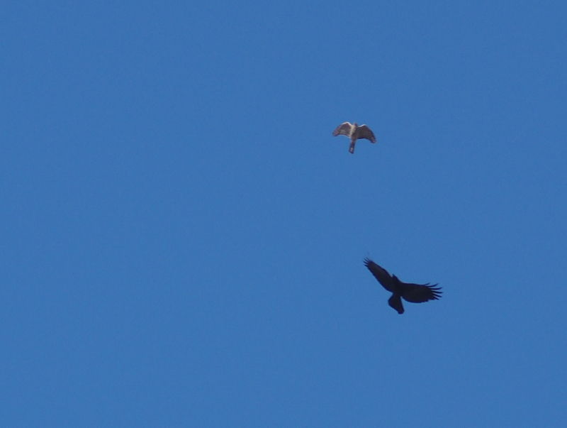 猛禽類を嫌うカラスがちょっかいを出したのです。そうなると、両者の大きさが比較できますが、カラスのほうがはるかに大きい。オオタカはカラスとほぼ同じ大きさですので、この個体は間違いなくハイタカというわけです。