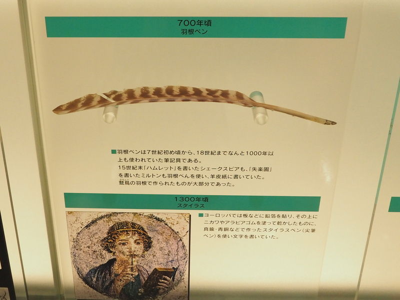 博物館では筆記用具の歴史も学べます。ただ、私はあまり関心が無く、基本的にスルー。ただ、これは「おっ、羽根ペンじゃん」ということで写真をパチリ。なんせ子供の頃、この羽根ペンに憧れていたものですから(笑)