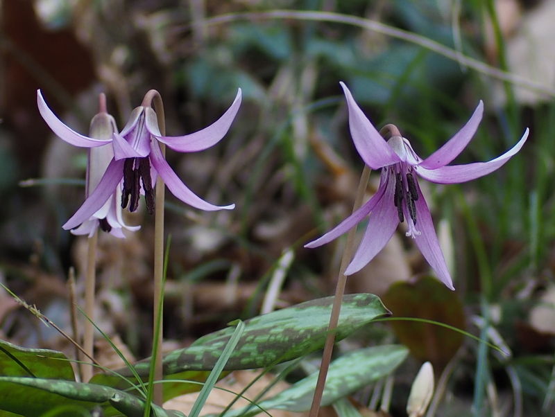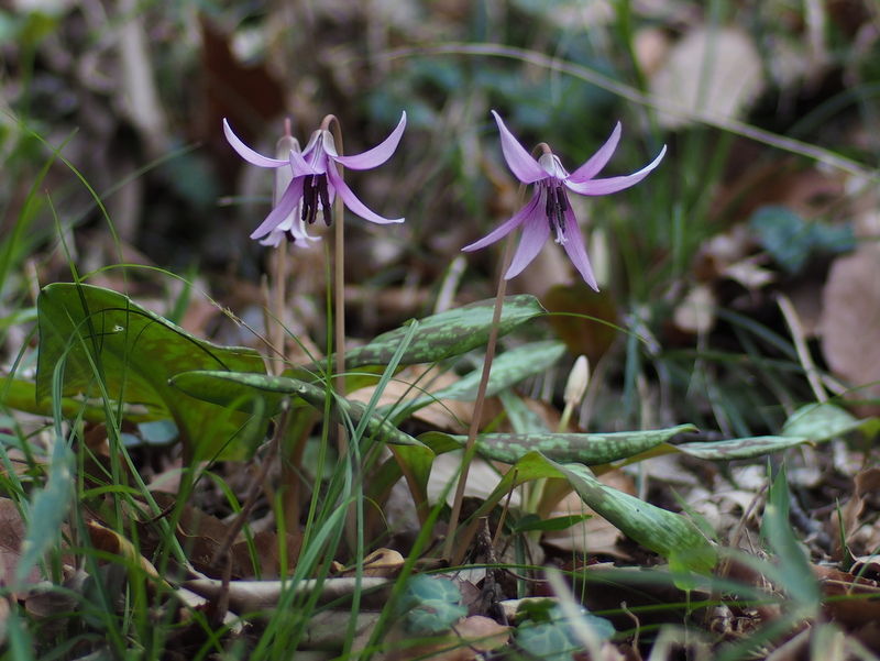ここがカタクリの群生地。うーん、やはりダメ(苦笑)。パッと見、全く咲いていません。でも、よく見ると、数輪の花が開いているではありませんか。こりゃラッキーですが、驚くほど早い開花です。