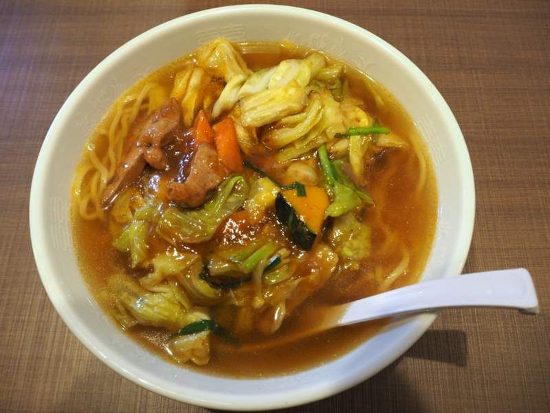 で、30分ほど行列に並びましたが、ラーメン屋で並んだのは10年ぶりぐらいかもしれません(笑)。スタミナラーメンとは、具のレバー、キャベツ、人参、かぼちゃ、ニラに甘辛いあんを絡めて、ラーメンの上に載せたもの。どうやら、スープの無い「スタミナ冷し」のほうが人気があるらしく、同行の皆さんはそちらを注文しましたが、スープ無しのラーメンが好みではない私は普通のラーメンのほうを注文しました。