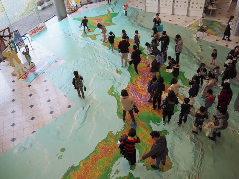 ところが今回、館員の方に正しい観賞方法を教えてもらって観ると、驚いてしまいました。すごい立体画像です。日本列島の南側の南海トラフの辺りに立っている人は、水面に浮かんでいるように見えます。まあビックリでした。
