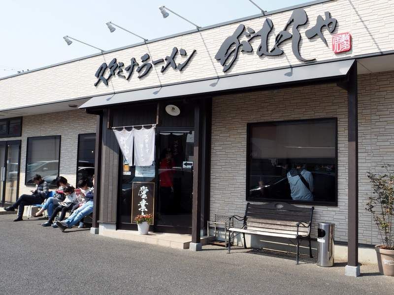昼食は、はんぞうさんが是非食べてみたいということで、ラーメン屋「がむしゃ」のスタミナラーメン。相当の人気店らしく、お昼時に訪ねると行列ができていました(写真では分かりませんが、店内にも行列が続いています)。