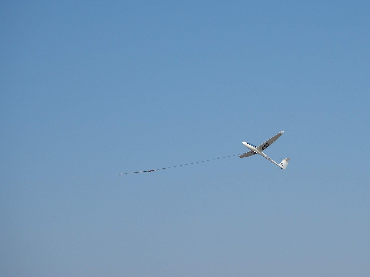 こちらは見慣れた離陸方法ですね。飛行機に引っ張ってもらう航空機曳航です。大会の合間に体験飛行会もやっているとのことで、どうやら野田市の子供たちが乗り込んでいたようです。高所恐怖症の私には、「乗せてやる」と言われても絶対に無理ですね(笑)
