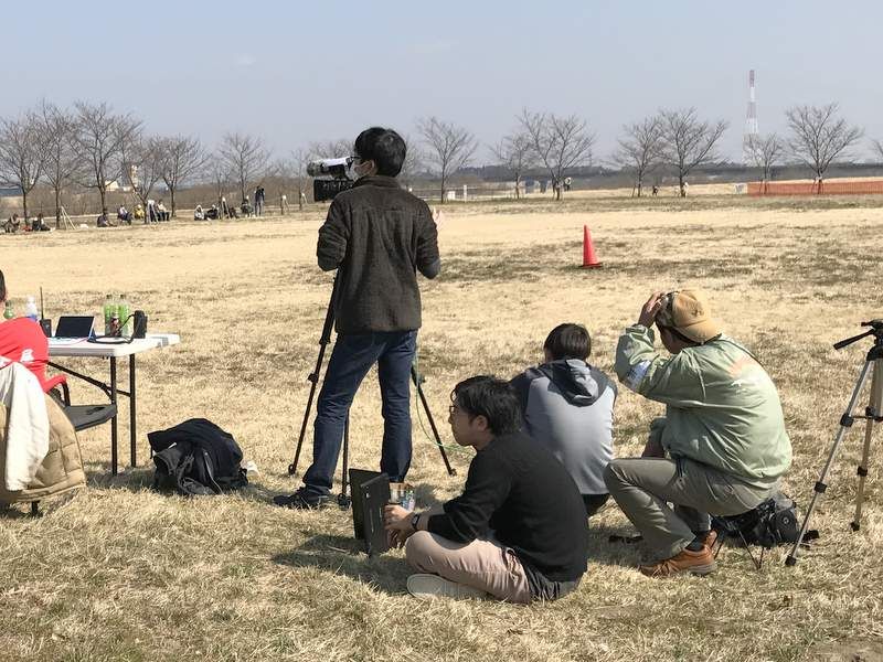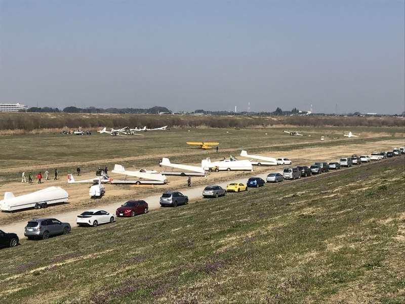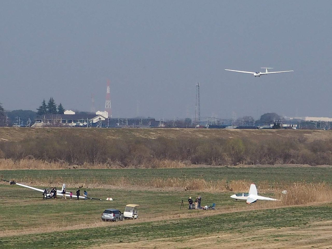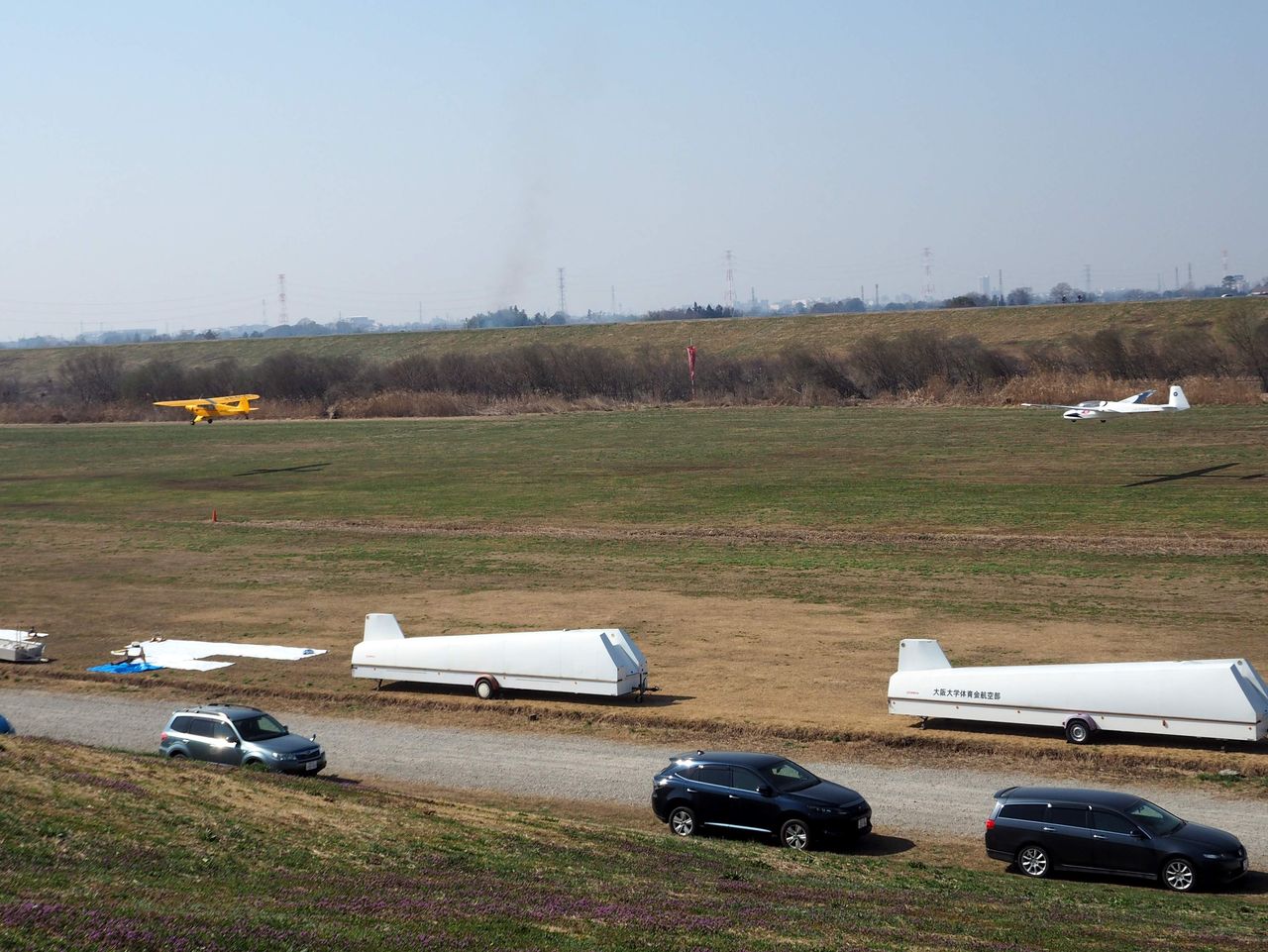 フライトフェスタ会場に着く前に、別のトビモノの大会に遭遇(笑)。いつもの関宿滑空場ですが、なんかざわついています。なんでも旧帝大7校(北大、東北大、東大、名大、京大、阪大、九大)で競う七大戦グライダー競技というイベント。ポイント地点を周回して、どれだけ早く着陸できるかを競っているそうです。