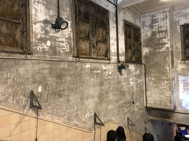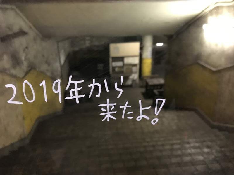踊り場より下に行く階段はガラス戸で封鎖されていました。この下には使われなくなったホームがあり、ときたま通り過ぎる列車の振動が伝わってきます。それにしてもガラスにペイントされたこの文字はアートでしょうか。それとも単なる落書きでしょうか(笑)