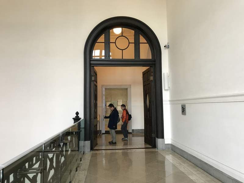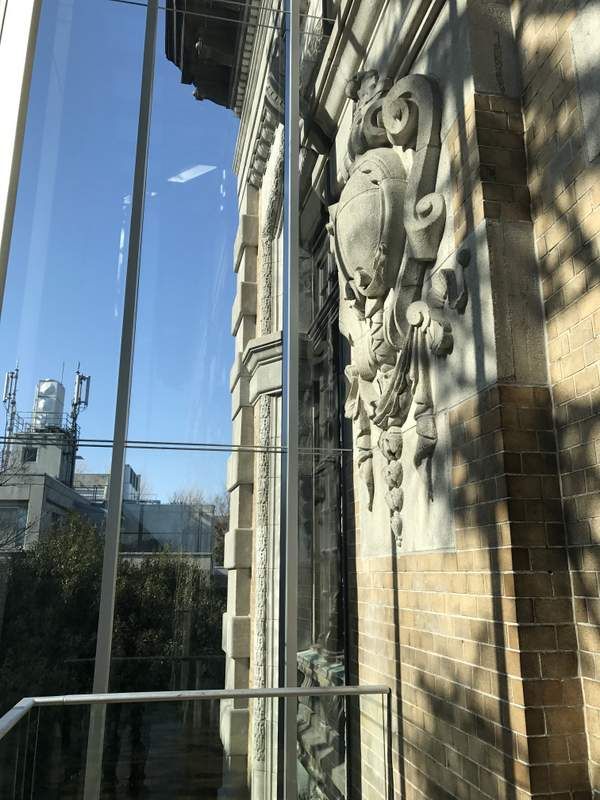 次に近くの国際子ども図書館へ。建物自体は1906年に建てられた旧帝国図書館だそうで、とても重厚な造り。本来の建物の外へ張り出すように増築したスペースがあり、こんなふうに外壁を「部屋の中から」眺めることができました。