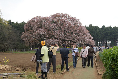 さて、吉高の大桜です。もう素晴らしいの一語です。2日前ぐらいが最高の見ごろのようで、この日は随分葉が出ていました。それでも花はまだ散り始めてはいませんでした。私の知っている桜の3倍はあろうかという大桜が、まさに桜色に染まった光景は圧巻でした。