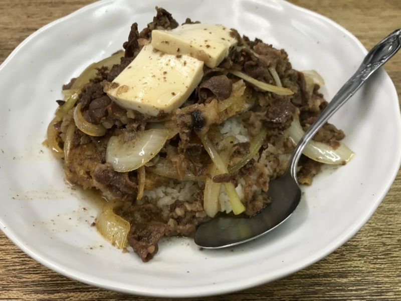 大学入学直後にこの店の牛めしを食べて、あまりの美味さにすっかり虜になってしまいました。特に写真のカツ牛は、ライスの上にトンカツを載せて、その上から甘めに煮込んだ牛肉をかけたB級グルメの傑作(笑)。貧乏学生でしたが、バイトで稼いだお金を工面して通い詰めたものでした。