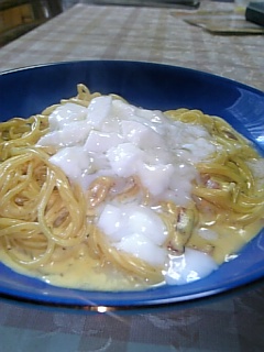 牛乳(生クリームないから)、卵黄2個、ベーコン、スライスチーズ(粉チーズなかった)で作りました。