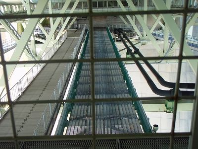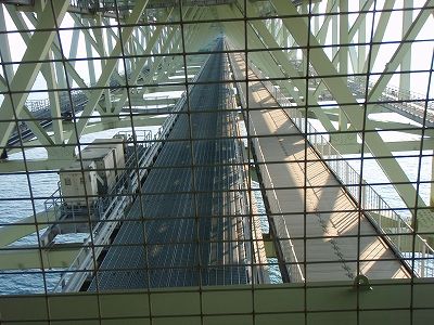 右の写真は淡路方向を向いていますが、この通路が永遠と淡路まで続いています(2キロくらい?)うーーん、この状態のままで自転車で走ると速攻で明石海峡にまっ逆さまですね。