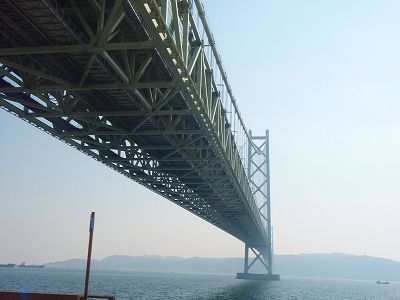 明石海峡大橋は風を受けると横にも縦にも揺れます。それも結構な揺れなので、歩いていると「おっとっと」となります。しまなみ海道は短い橋だし、つり橋といっても構造が違うから揺れないんでしょうねぇ〜。