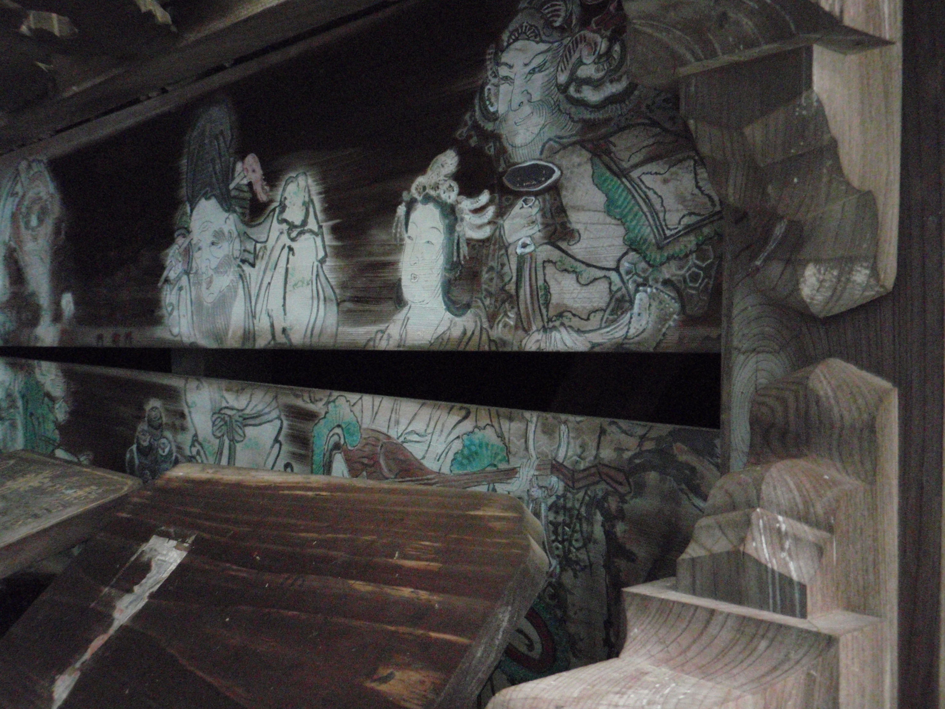 向かって左側にはたくさんの石像があって、一番奥に太子堂があります。前から見ていたら何か天井に白い色が見えたので覗いてみると、の七福神図がかかれていました。結構綺麗ですね(天井の板がずれちゃってるけど)