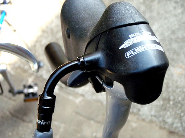 ついでに、クリスピのSORAはシフトケーブルが横出しなので、フロントバッグの大きさに制約があったのですが、バナナ(Vブレーキ用のもの)を使って下向きに変更しました。これで、フロントバッグのサイズに制約がなくなりました(厚さの制約)。