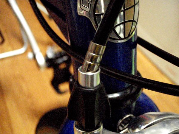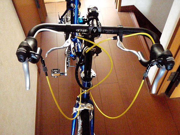 なんとなくケーブルの処理がしっくり来ませんが、折りたたみ自転車の場合はハンドルを外す事も考えて長めにしていますので、それほど気にしなくてもいいかな?(一部だけアウターが白いのは、、気にしないでください、、足りなかったんで〜す)