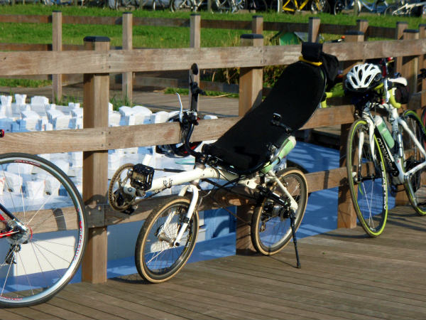 流山市はてっきり利根運河の南側だと思っていましたが、集合場所の利根運河交流館前は流山市なんですね〜。全員集合したのでブリーフィングします。たすけさんお手製の地図まで頂いて、ポタの振り返りができるなんて楽しい工夫をしてもらえました。ここでE-ponさんのお見送りがありました(ありがとうございました〜)フリーさんのORIバイクも試乗させてもらって、暗技研パワーを初体験できたのも嬉しい出来事でした。ペダル漕がなくても進む感覚が新鮮!