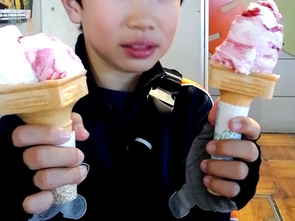 s_111113_1509~03 s_PB130853息子は梨&ラズベリーで、僕はラズベリー。息子はブルーベリー注文したんですが、おばちゃんが間違えた、、、「あ!間違えたね」と手を出しましたが、息子は「いいです、いいです」と食べてまっした。うーん、変なところが父に似てしまったかな?そこは「替えて」って言ってもいいんだけどね(笑)