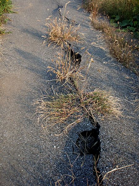 s_PB130851少し船橋に入ってからアンデルセン公園の横を走って桑納川沿いに新川を目指す事にしました。良い感じの道が続いてのんびりと走っていると、川沿いに舗装らしいものが見えるので、桑納川のすぐ横のCR?に入って快走していると、突然地割れと10センチくらいの段差が!!!!