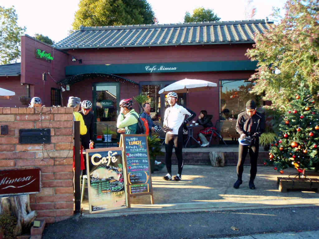 風に耐えた後は神尾橋から船尾までの坂でした。さっき登坂モードを習得しているので最初からマイペースで登り切りまいたね〜後は下って昼食ポイントに到着!見た目はカフェですね。テラス席もあって温かいと外でのんびりしてもいいかも?早速店に入ってのんびりします。