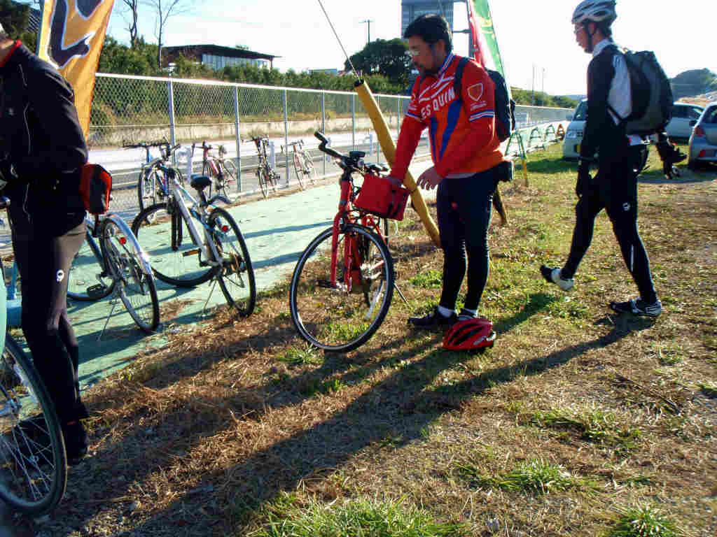 集合場所に到着すると、すでにみなさんお集まりでした(すみません、いつもジャストで、、)でも、なんか様子が変なのです。MTBがひっくり返ってるし、あまり話し声が聞こえない、、と思ったら10さんのROCKが手術中でした(笑)利根川CRで再発しましたが、、みんなからシングル化命令出てましたね〜(笑)