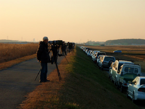 後は時速15キロでのろのろと走りましたよ。途中で手賀川CRのコミミズク撮影隊に遭遇!のろのろついでに止まって双眼鏡を持ったおじさんに話を聞きました。今日は6羽居るそうで、正面から見るとまんまるの顔をしていると教えてもらいました。(今日は100人くらいかな?埼玉に行くと500人くらいが並んでるよ〜ってびっくり!)
