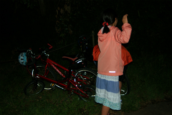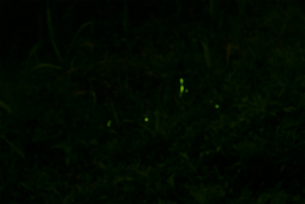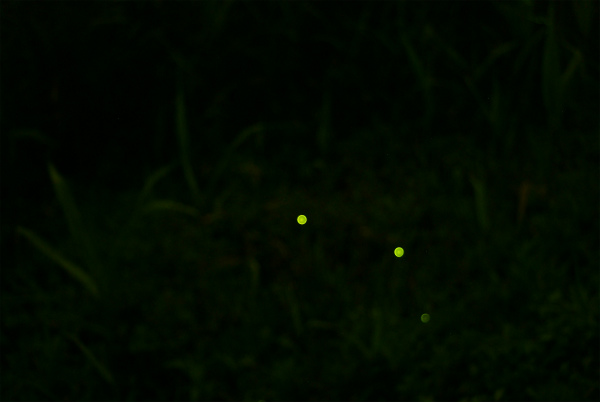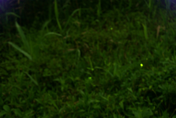 入ってすぐにちいさな光がポツリ、ポツリと草むらに見え始めると、湿地の方には十数カ所にピカピカと光が見えてきました。目が慣れ始めてからは、水辺の周りとかにヒラヒラと舞う光も出てきました。乱舞までには程遠い数ですが、期待していたよりはいっぱいホタルが光ってくれました(嬉)。