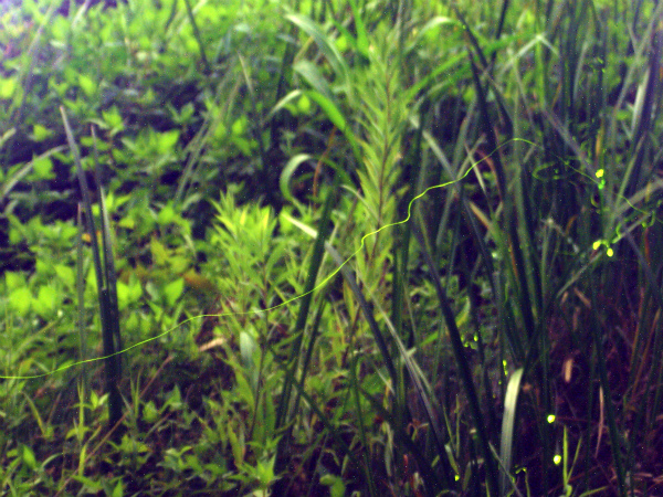 真っ暗な中、ファインダーを除くと、、ホタルの光と全然違うところに向いてるし、ピントがあっていないし、真っ暗になる前にスタンバイして、セッティングしないといけないのかも〜。とりあえずピントがあったと思ったのがこれですが、周りが明るくなりすぎたので、まるで金魚の水槽を撮ったようです(笑)