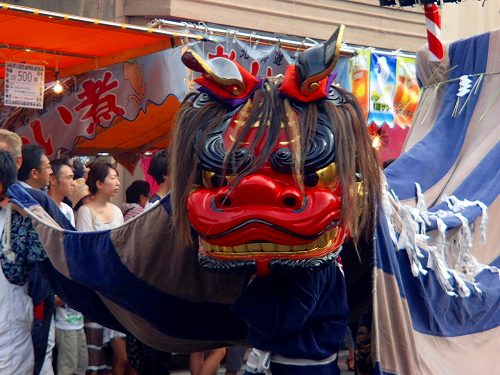 こんな感じで、おねーさんのすっごく盛った頭にビックリしたり、息のあった歌に関心したりして、お祭り気分は盛り上がります。かき氷を食べながら休憩していると、「ボーンボーン」と花火があがったと思ったら、細い路地からこんなのが出てきました。