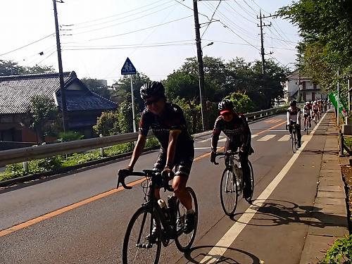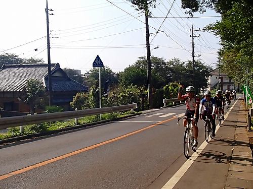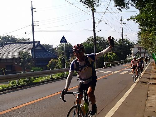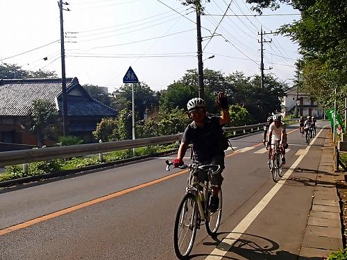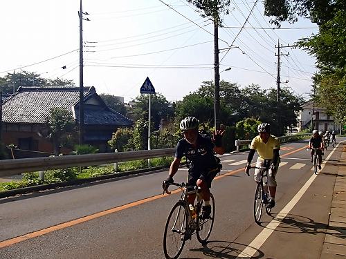 5分もしないうちに、自転車集団が来ました!!我孫子のりぴーさんとIWAさんのお二人が先導されていたので、高速列車かと思いましたが、出発したてなので徐行中〜、お見送りにはちょうどいいスピードでしたよ。