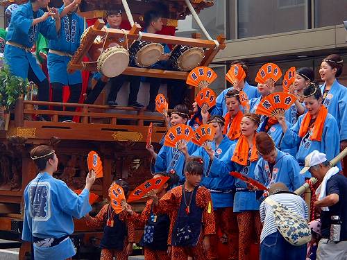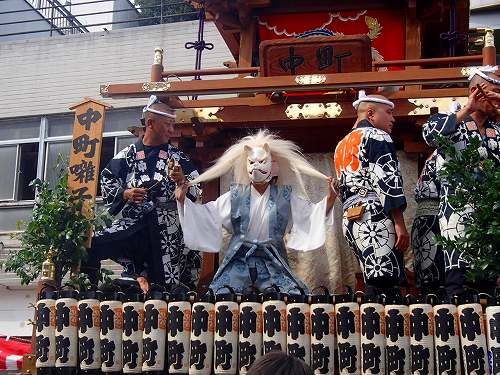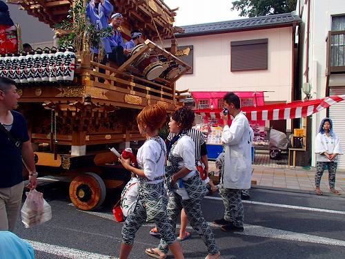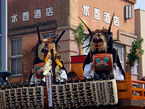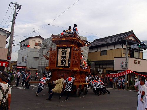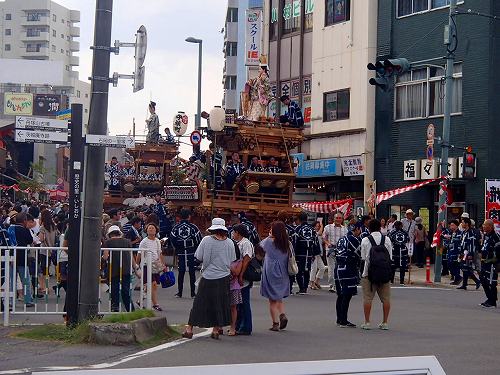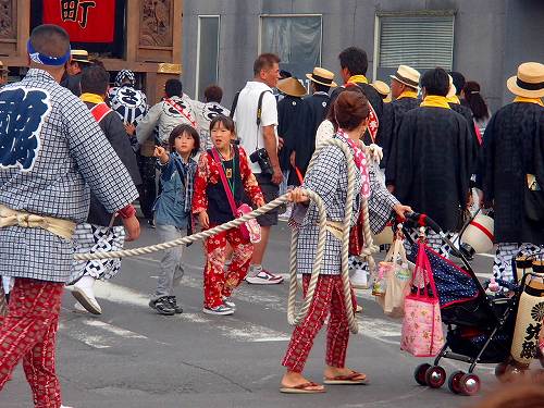 こんな感じで男たちが力ずくで曲げていきますし、こんなベビーカーを押したおかーさんが先導してたりして、町ぐるみでお祭りを楽しんでるのがいいお祭りですね。この山車は電線に触れる前に人形も含めて下がる構造になっていて、よくできていると関心してしまいますね。