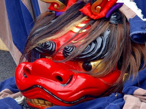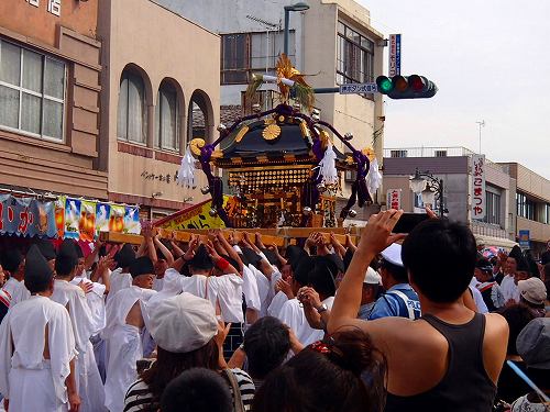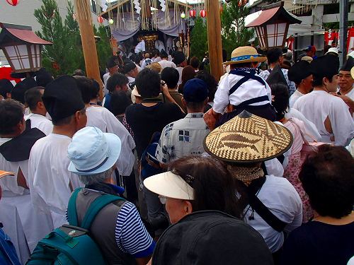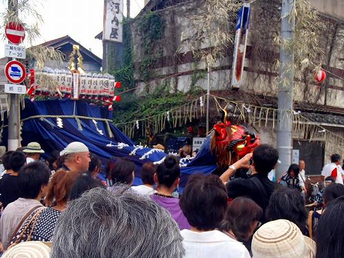 この細い道を幌獅子やお神輿が通るのですが、細すぎるので大変です。最後に御仮殿にお神輿を収めて、今日のミッションは完了という事のようですね。この後は幌獅子や山車はあっちこっちで観光客を楽しませてくれました。