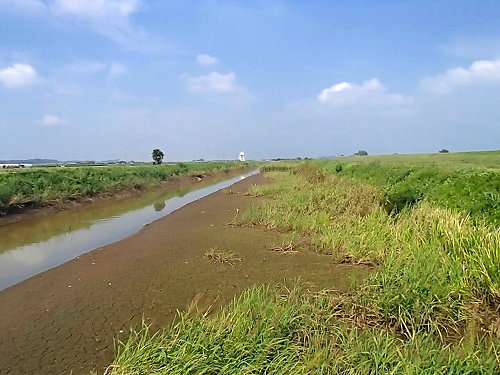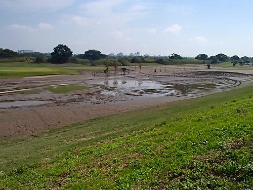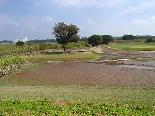 増水した場合に、右側(ゴルフ場がある)から左側(農免道路がある)に水を流す事で、民家を守るそうですが、今回の台風では活躍せずに済んだようです。でも、この右側のゴルフ場には爪あとが残ってました。ゆうゆう公園も泥だらけだったので、今年も水没したようです。
