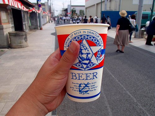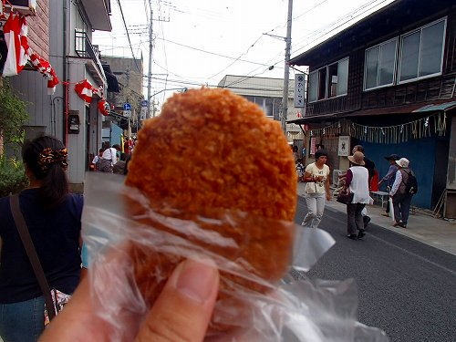 萩野商店さんでメンチを購入し、とんかつしまださんで生ビールを購入し、大満足です(笑)。お祭り=出店=テキ屋さんになりますが、お祭りしている町のお店に貢献したいなとおもったので、このへんは地元のお店に還元です。ちょうど、御仮殿の近くに居たので、河内屋さんの交差点で、お神輿が来るのを待ちます。