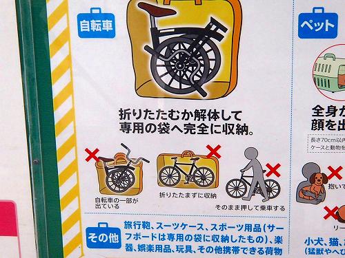 よく見ると、自転車はBROMPTONです。説明には「折りたたむか解体して専用の袋へ完全に収納。」と明記されていました。最近、ニュースで聞いていた、輪行ルールが厳しくなってきているという話しがコレだったのかもしれませんね。「専用」とか「完全」とかちょっとくどいような言葉の使い方ですもんね。