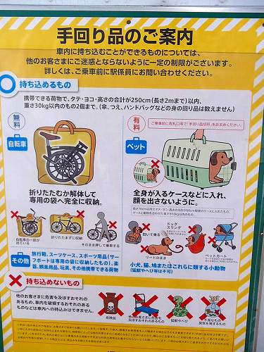 手回り品の広告ですね。縦横長さの合計が250センチメートルで長さが2メートルまでのようです。ペットは有料で自転車は無料との事です。ま、自転車はカバンに入ってたら無料という事しか知りませんでしたが、サイズも決まってるんですね。ペット有料という事も知らなかったです。そういえば、石岡へ向かう車内に居たケバいおねーさんの下のカバンがピョコピョコ動くので、娘が気にしていたら、ネット越しにミニチュアダックスの顔が見えたらしく大興奮してました(笑)。偉いね吠えないんだね。