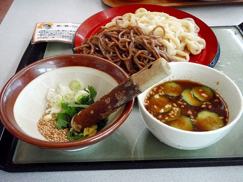 ちょっとお腹が空いたので、帰りに「道の駅庄和」に立ち寄って、「麦ぼうず」で「合盛りすったてうどん」を食べましたが、美味しかったです!白いのはコシのあるツルツルしたうどん、黒いのはそばじゃなくて黒豆が入った細いうどんで、コシはあまりないですが、どちらも美味しかったですよ。トイレ前には自転車ラックも置いてあったりして、イイ立ち寄りスポットですね。