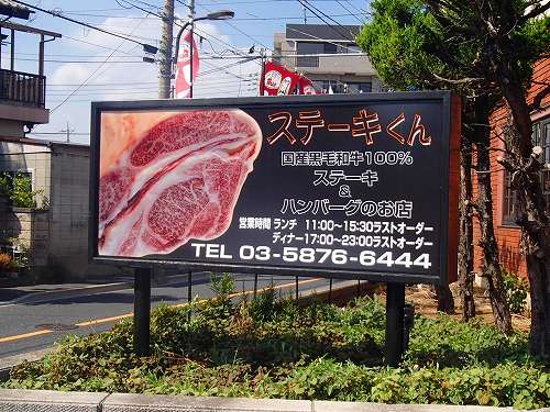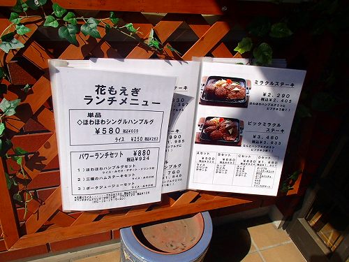 「ステーキ君」です。ネーミングに惹かれて、ファミレス好きな子供たちの反対を押し切って入店!「ふわふわハンバーグ」のノボリがあがっていたので、ステーキよりハンバーグ目当てです。入店して見るとちょっと格式が高そうですが、まぁ、気にしないで行きましょう!ん?花もえぎって聞いたことがある名前だけど、、水元だったかな?